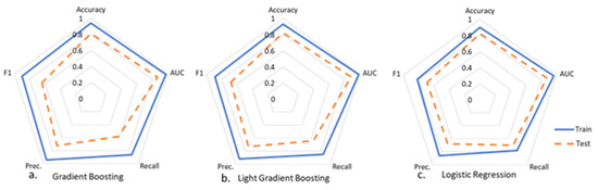Comparison of the performance of the trained model on the training and test datasets for (a) Gradient Boosting, (b) Light Gradient Boosting, and (c) Logistic Regression trained models, where F1, AUC, and Prec stand for F1 score, Area under the curve, and Precision respectively.