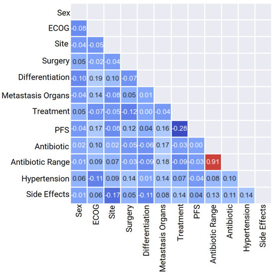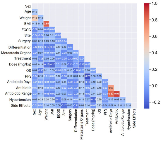 When analyzing different variables, one should consider whether the observations are independent or not. This is particularly important when no repeated measure design or matched data exist. In this analysis, we found no repeated observations. We calculated the correlation coefficient and presented it in a heatmap to better understand the relationship between each pair of independent variables (Figure 2). Based on the assumption of independence, we have excluded the following independent continuous variables: Age, OS, Dosage, Antibiotic Days, Weight, and BMI. These variables showed a high correlation coefficient () with each other. Generally, a weak positive correlation falls between and , a moderate correlation between and , and a strong correlation between and [61].