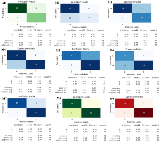 The confusion matrix in Figure 4, as well as the one associated with the classification report, shows the performance of the nine classification models. The figure provides a comprehensive comparison of the models based on the test data for the actual and predicted counts of each class, while a classification report shows the calculated metrics of each class. Similar results were observed among the various models considered in terms of accuracy, precision, recall, F-Beta, and AUC. Although these metrics may not reach the typically defined standards, they align with results seen in other clinical research [42,62].
