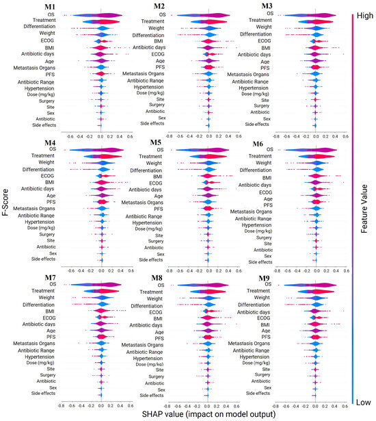 Figure 6 illustrates the significance of each model’s features. Nearly all of the models demonstrated a consistent significance in the structural aspects of each model’s features. All models incorporated OS, Age, and PFS, underscoring the relevance of dietary and lifestyle factors in colorectal cancer (CRC) [54,55]. However, the positions of ECOG, BMI, and Antibiotic Days were permuted in various models, as were Metastasis Organs and PFS, along with Site, Surgery, Sex, and Antibiotics. Despite these variations, similar significance values were observed for each model’s features across the nine models. Even though the Antibiotic variable does not present a high significance, Antibiotic Days do. For this reason, taking a cancer treatment at the same time as an antibiotic could have a high influence on survival [52].