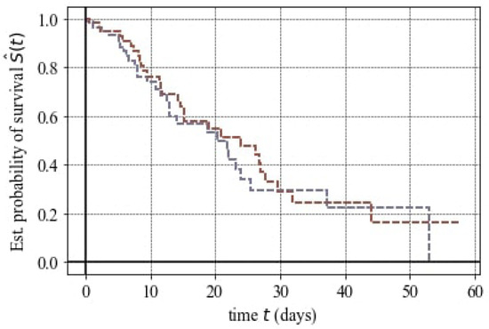 The survival function derived from the Kaplan–Meier estimator provides a valuable quantification of survival analysis, depicting the relationship between time and the probability of surviving beyond a specific time point. Figure 7 visually represents the probability of survival over time. At any given moment, the survival function is computed as the ratio of patients surviving beyond that point to the total number of patients. The resulting curve takes the form of a step function, with steps occurring at time points where one or more patients have died. The plot distinctly indicates that there is no apparent difference between patients who took antibiotics and those who did not.