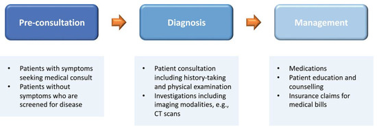 A standard patient journey in healthcare, encompassing three key stages: (1) pre-consultation involves patient registration, medical consultation, or health screening; (2) diagnosis includes patient consultations, examinations, and supplementary investigations; and (3) management comprises medication, patient counseling, education, and reimbursement for medical bills. LLMs exhibit potential to improve the patient experience at each touchpoint in this journey. Source: Adapted from [53].