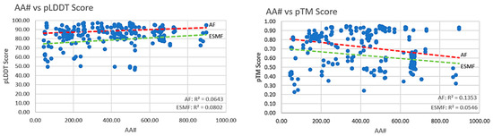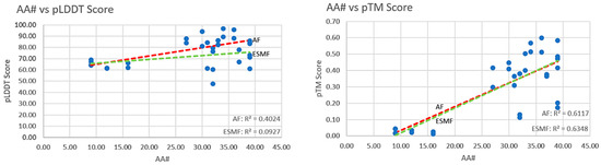 For a comparison among the peptide and protein classes, we used two cut-offs: AA < 40 (amino acid count less than 40) and 40 < AA < 1000 (amino acid number between 40 and 1000), respectively. The first was used to understand the predictability of polypeptides below 40 amino acids from AF2 and ESMF, which resulted in a correlation of ~0.83 using the pLDDT score and ~0.95 using the pTM score. The second cut-off was of all of the proteins above 40 amino acids and below 1000, which resulted in a correlation of ~0.69 using the pLDDT score and ~0.84 using the pTM score. The Pearson correlation (corr.) and correlation coefficient (R2) for the pTM scores from both algorithms agreed better than the pLDDT scores. Recently, an AF2-based mode, AFDistill, estimated the structural consistency measured by the pTM or pLDDT scores for a given protein sequence. Interestingly, the experimental results demonstrated that the pTM-based structural consistency scores positively impacted the model’s performance more than the pLDDT-based scores. This indicates that pTM scores might be more reliable than pLDDT scores for evaluating protein structure [63].