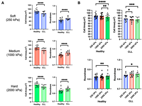 Representative images of fixed T cells from healthy donors and CLL patients on surfaces of different elastic modulus are shown in Figure 1D. Having been purified using techniques that are independent of subtype, these samples contained a mix of naïve, memory, and effector cells that are representative of the donor population. Most prominently, cells from CLL patients appear smaller than those from the healthy counterparts. This was confirmed by morphological analysis comparing cell Area across substrate stiffness (Figure 2A). Cell Roundness was also compared, recognizing that cells appeared to have different shapes across surfaces (Figure 1D). Notably, cells from CLL patients showed higher Roundness than cells from healthy donors (Figure 2A), supporting the concept that donor disease state affects cell morphology.