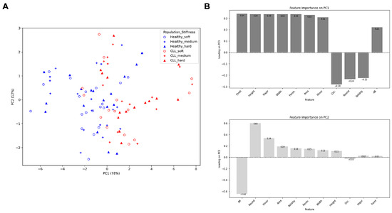 PCA reveals the variance between CLL and Healthy T cells and identifies important morphological features contributing to the variance. (A) Two-dimensional representation of PCA analysis. Projection of the data along PC1 showed a separation between Healthy (blue) and CLL (red). Three stiffness conditions which the data were derived from were also shape-coded. Each data point represents an individual sample. (B) Feature importance on PC1 and PC2.