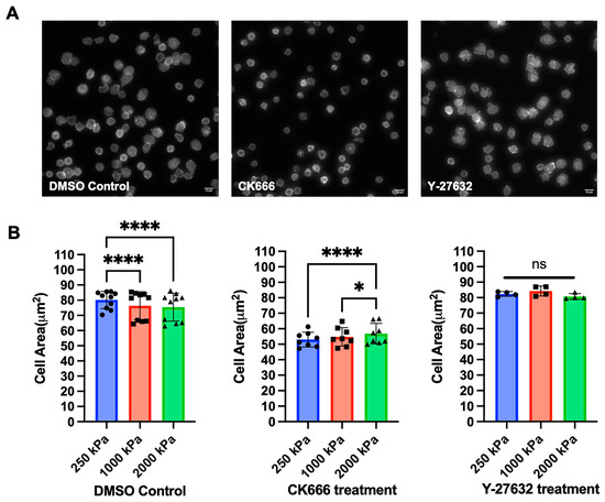 Inhibitor studies. Arp2/3 complex inhibitor CK666 (Sigma-Aldrich, Burlington, MA, USA) (100 μM) was used to inhibit actin polymerization [24]. ROCK inhibitor Y-27632 (Sigma-Aldrich, Burlington, MA, USA) (60 μM) was used to inhibit actomyosin contractility. Cells were pretreated with either CK666 or Y-27632 in complete culture media at 37 °C for 15 min and then were seeded onto the prepared PDMS substrates. The cells spread in the presence of the inhibitor for 40 min, followed by fixation, permeabilization, and incubation with Alexa Fluor 488 phalloidin, as previously described.