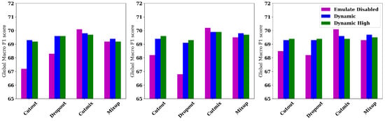 Peer class macro F1 scores for each augmentation and regularization baseline method when training in combination with the dynamic High variant of EMULATE, the three different architectures on the saccade dataset.
