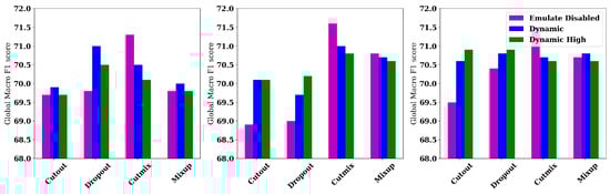 To assess the importance of EMULATE, the three architectures are trained using the three different setups of the proposed data augmentation methods (static, dynamic, and dynamic high) and are compared first with a regime where no augmentation is applied, and then with a regime where several non-physiological data augmentation and regularization techniques are explored. Finally, the complementarity between the proposed methods and the different baseline methods is explored.