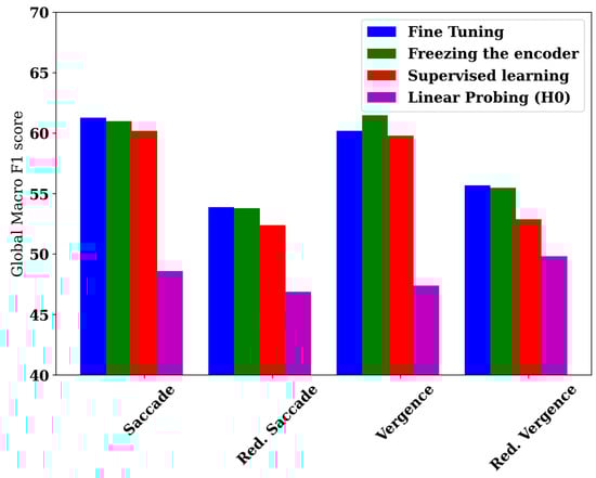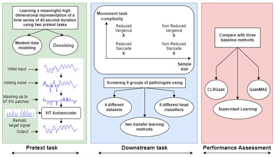 On the other hand, the papers [,,,] explore the application of SSL for eye movement coordinate estimation. In our study, we prefer using the Pupil solution for the estimation due to its physiological criteria and high accuracy. This solution has been extensively used in studies. Therefore, in this study, we explored learning the screening task from eye movement position signals.