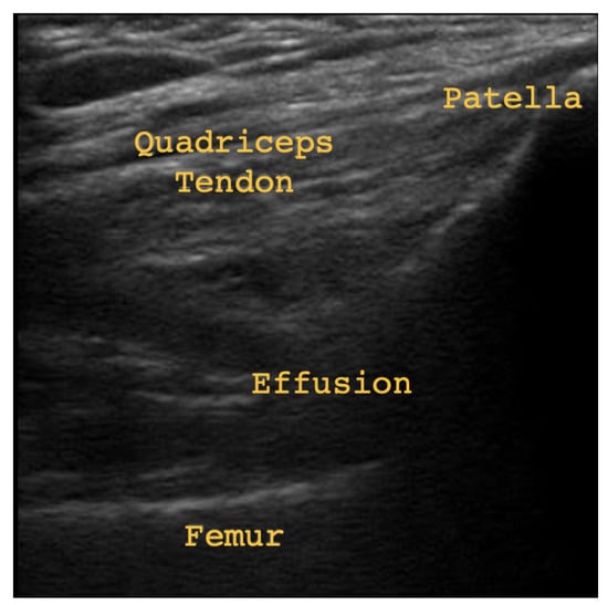 Suprapatellar longitudinal view of the knee. Knee joint recess distension in region labeled Effusion. Negative for thickened synovium.