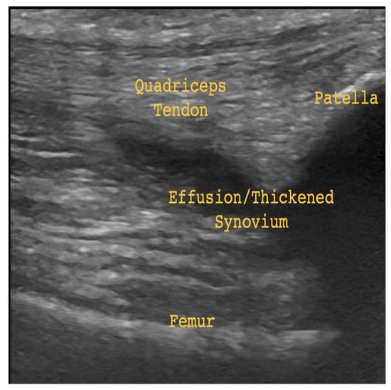 Suprapatellar longitudinal view of the knee. Knee joint recess distension and thickened synovium in region labeled Effusion/Thickened Synovium.