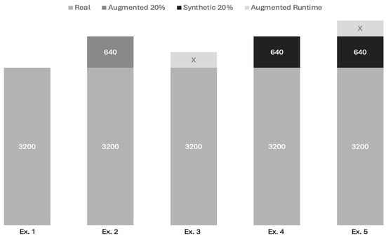 CNN for Ex. 1 trained on 3200 real images, 1600 negative for thickened synovium with knee joint recess distension, 1600 positive for thickened synovium with knee joint recess distension. CNN for Ex. 2 trained with additional 640 augmented images, 320 per class. CNN for Ex. 3 trained with additional X augmented images at runtime (augmentation at runtime is probabilistic, we cannot provide the exact number of augmented images). CNN for Ex. 4 trained with additional 640 synthetic images, 320 per class. CNN for Ex. 5 trained with additional 640 synthetic images, 320 per class, plus additional X augmented images at runtime (augmentation at runtime is probabilistic, we cannot provide the exact number of augmented images).