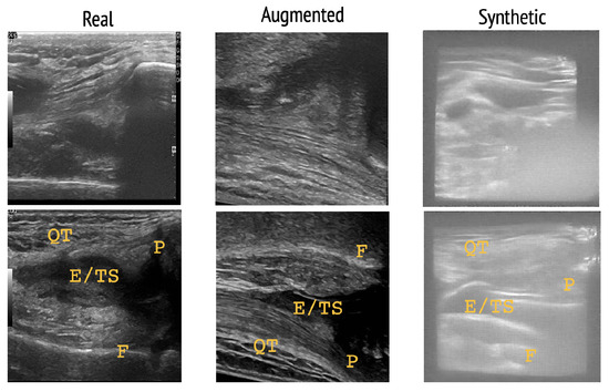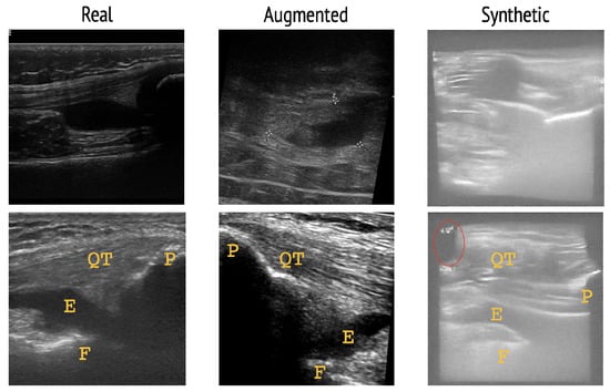Real, augmented, and synthetic image samples of knee joint recess distension positive for thickened synovium. Labeled F: femur, P: patella, E: effusion, QT: quadriceps tendon, TS: thickened synovium.