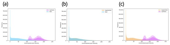 Pixel intensity histograms for real, augmented, and synthetic images. Real image mean = 47, standard deviation = 43. Augmented image mean = 52, standard deviation = 47. Synthetic image mean = 158, standard deviation = 31. (a) Real and synthetic image pixel intensities. (b) Real and augmented image pixel intensities. (c) Augmented and synthetic image pixel intensities.