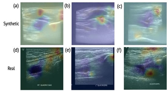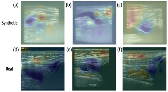 To rigorously understand and validate our CNN’s performance, heat maps were used to verify if points of interest identified by the model aligned with human opinion, and if these points were the same across real and synthetic images. The heat maps illustrated that the CNN attributed importance to relevant regions, near areas of noticeable effusion. Moreover, the regions identified in synthetic images matched those identified in real images for similar views. These observations suggest that the CNN’s decision-making is aligned with human opinion, and that the synthetic images maintain enough biological and visual fidelity for thickened synovium and joint recess distension to be identified consistently.