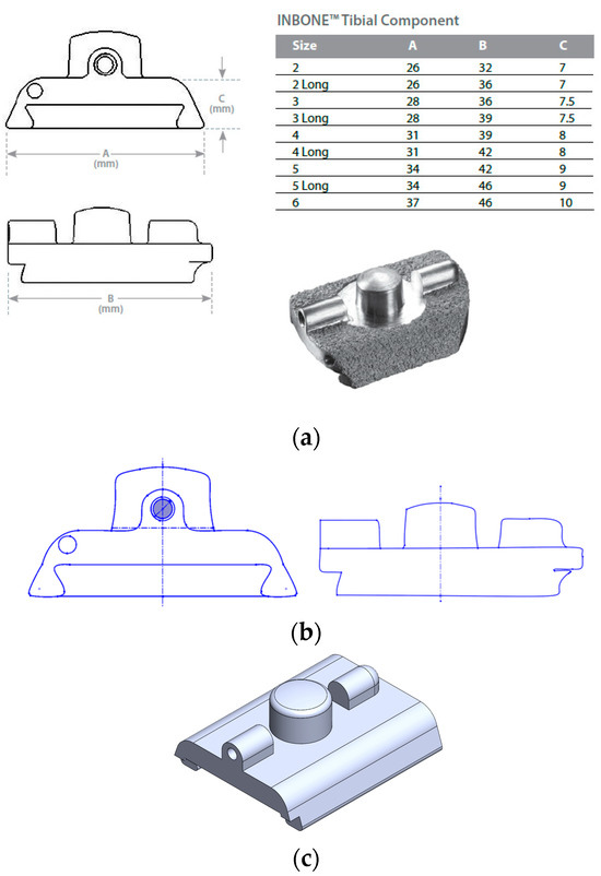 The precise geometry of the implants could not be obtained due to the proprietary nature of their designs. Wright Medical and Exactech provided limited dimensions of the implant components in their surgical technique guides, including each component’s length, width, and height. Therefore, we used a reverse-engineering process to model the implants. We chose a size 2 implant based on a prior study by Yu [23] in their FEA study of the INBONE II. This is the smallest size available and is suitable for a conservative estimate of implant stresses, as the highest stresses are expected from the smallest size. The coronal and sagittal views of the INBONE II tibial component with the corresponding implant dimensions per size are shown in Figure 9a. We assumed that the proportions of the component elements were true to the real implant. Screen clips were taken from these images and optimized using Microsoft Paint. Then, these views were saved as DXFs to import into SolidWorks (Figure 9b). This process maintains the feature-to-feature relationships as the assumed proportions remain consistent. The features were exported to create the completed part in Figure 9c.