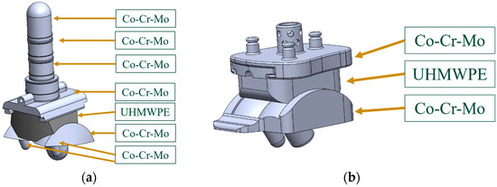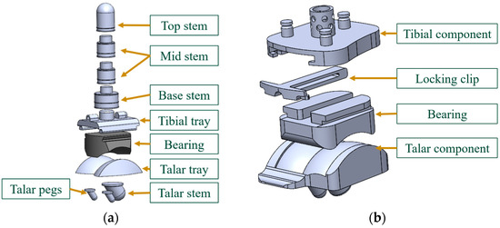 The tibial and talar components typically have porous coated pegs and stems that are inserted into native bone for primary fixation and bony ingrowth. Bone cement can be used to augment the fixation if needed [14,15]. These components are typically made of cobalt chromium molybdenum (CoCrMo), a high-stiffness and high-strength material.