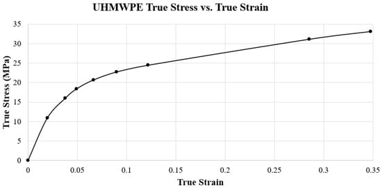 In addition to the elastic behavior, plastic behavior was modeled for the UHMWPE to represent the material’s response after yielding. This behavior was extracted from a true stress–strain curve. This curve (Figure 14) was created with data for UHMWPE with a grade of virgin GUR 1020 provided by Miller [29]. This specific true stress and true strain data for this grade of UHMWPE have been used consistently in other FEA studies by Martinelli, Zhang, and Yu [7,23,24]. The yield strength for this grade of UHMWPE is 10.86 MPa, the lowest value reported in the literature among grades of this polyethylene [30]. A conservative estimate of von Mises stress on the bearing is obtained, predicting yielding earlier than expected. The manufacturers did not provide specifics on the grade of UHMWPE. It is also important to note that the Poisson’s ratio of UHMWPE is 0.46, which is close to the incompressible value of 0.5 observed on rubbers. This indicates that minimal volume changes are expected as the material expands laterally and contracts longitudinally under compression.