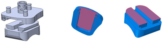 The interactions between components consisted of ties and contacts. Ties were utilized for components that have no relative motion between them, making the two components one piece. For the INBONE II, the tibial tray was tied to the stem subassembly and the bearing. The talar tray was tied to the pegs and stem. For the Vantage, the tibial tray was tied to the bearing and the locking clip, and the locking clip was tied to the bearing. A visualization of the tibial tray-to-bearing tie interaction is shown in Figure 15. Contact interactions are appropriate for surfaces with sliding relative motion between them and where the pressure between them is relevant. These surfaces were the articulating surfaces of the implant, which were the top bicondylar surface of the talar tray and the bottom bicondylar surface of the bearing. These surfaces and the corresponding settings for this contact interaction were inputted into ABAQUS, as shown in Table 2. They were determined as the best fit for this analysis based on an FEA study of an indenter–block contact interaction performed by the authors [27]. The normal behavior was assumed to be “hard” to indicate that the contact pressure would be computed as the surfaces are in contact. The tangential behavior was assumed to be based on a Coulomb friction model. The friction coefficient of μ = −0.04 has been used vastly within TAA FEA studies with CoCrMo and UHMWPE [7,24]. It has been benchmarked as the appropriate coefficient in an experimental analysis of friction on joint replacement implants performed by Godest [31]. The surface-to-surface behavior is most relevant for curved surfaces, and finite sliding is utilized in regions that expect significant frictional behavior.