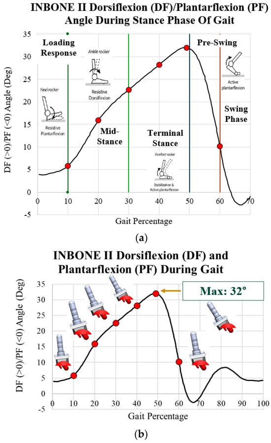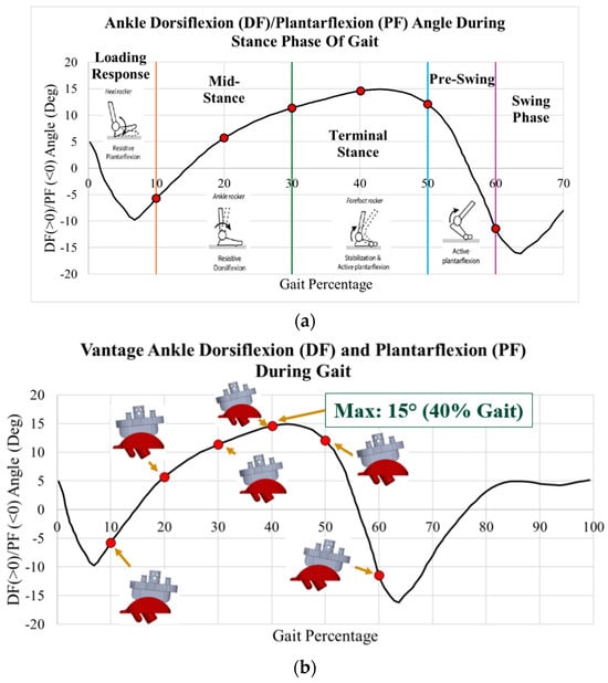 Dorsiflexion/plantarflexion curve of healthy patient used for Vantage [35]. (a) Subphases of stance; (b) rotated CAD models indicated on plot.