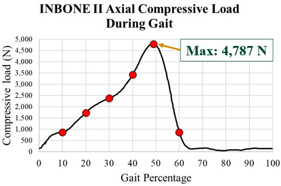 Axial compressive load on INBONE II patient during gait cycle [24]. Maximum load of 4787 N at 49% gait.