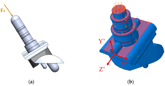 The resultant axial load was applied along the axis of the central peg of the tibial tray (Figure 21a). The loading among the pegs was computed using a statically indeterminate approach. The internal loads within the pegs were calculated based on the resultant axial load and compatibility relations. The forces in each peg were calculated using a MATLAB script and a system of three linear equations for all gait percentages of interest. The corresponding load per peg was uniformly distributed on the top of the pegs’ surfaces as shown in Figure 21b. A local coordinate system was attached to the side of the tibial component.