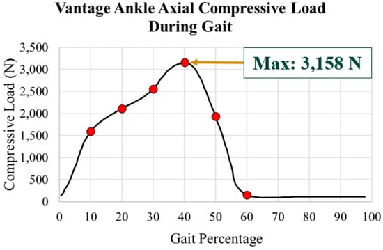 Axial compressive load on ankle during gait cycle used for Vantage [35]. Maximum load of 3158 N (40% gait).