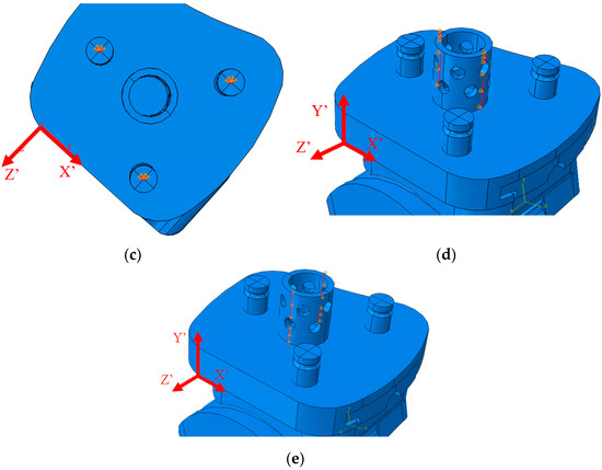 Vantage boundary conditions with (a) roller constraint on talar face, (b) pin constraint on talar pegs, (c) pin constraint on tibial pegs, (d) pin constraint on tibial pegs’ edges normalized to X’ axis, and (e) pin constraint on tibial pegs’ edges normalized to Z’ axis.