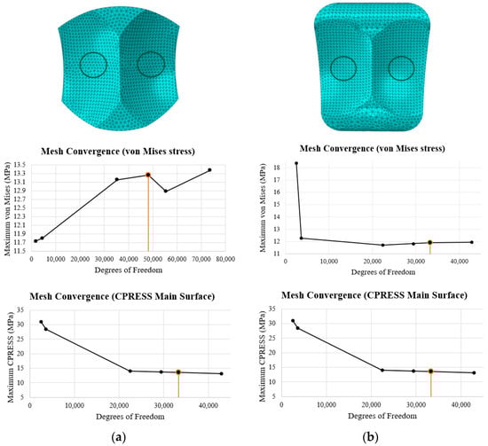 Summary of mesh convergence for bearing surface of both implants. (a) INBONE II converged at 0.75 mm with 48,102 DOF; and (b) Vantage converged at 0.65 mm with 33,294 DOF.