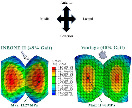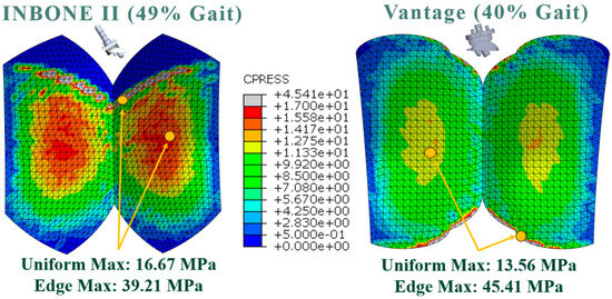 Zhang [24] performed a comparative FEA study in ABAQUS of three different TAA implants, including the Wright INBONE II. He post-processed gait data from TAA patients with these implants using multibody dynamics modeling (MSK-MBD) software [33]. A comparison of our contact pressure results found the edge effect of the contact pressure to be consistent with that of Zhang’s work with a magnitude of 41 MPa, which is only a 5% difference. There was a strong uniformity across both condyles in their model. However, the maximum value in the uniform region was higher by 24% (21 MPa).