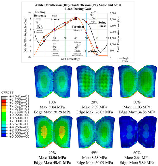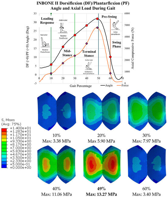Gait and loading data were extracted from the literature. This study aimed to evaluate the maximum stress on the implants during the stance phase and the behavior during each of the four subphases of the stance phase of the gait cycle. Dorsiflexion/plantarflexion data were collected by Zhang [24,32] on a post-operative INBONE II TAA patient while walking on force plates in a gait lab. These data are plotted with images of the ankle position during the four subphases of gait in Figure 16a. In particular, points of interest are indicated in red for 10%, 20%, 30%, 40%, 49%, and 60%. These characterize the entire spectrum of the stance phase of the gait cycle. With the angle for each of these points of interest, six separate CAD models were developed within SolidWorks to rotate the implant. When the ankle is flexed, the tibial component and bearing flex to the corresponding angle while the talar component is stationary. These rotated models are shown next to their corresponding gait percentages on the INBONE II dorsiflexion/plantarflexion angle plot in Figure 16b.