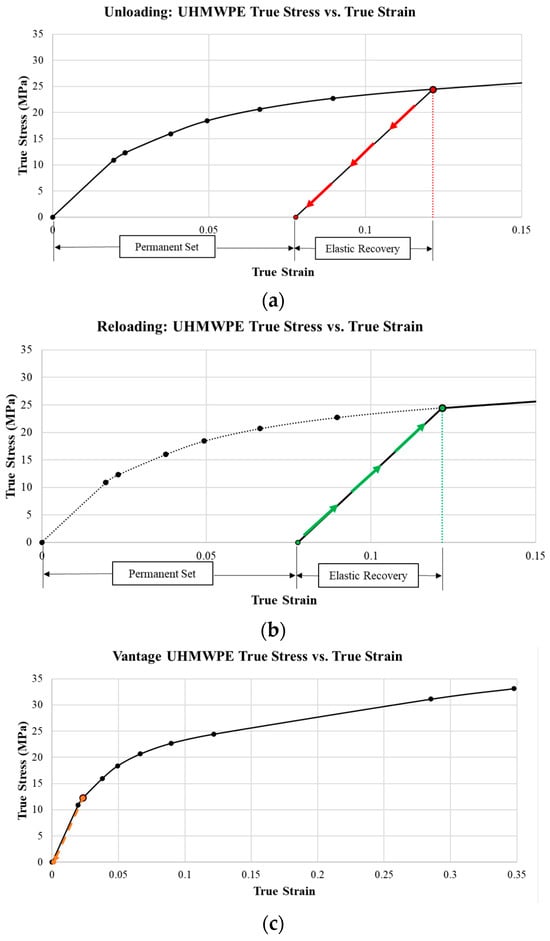 Effect of (a) unloading (exaggerated for clarity) and (b) re-loading (exaggerated for clarity) on UHMWPE on (c) the yield strength.