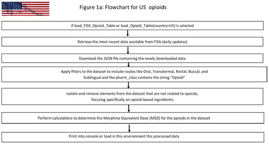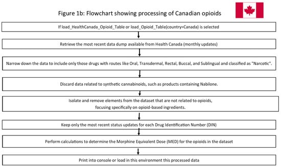Figure 1. (a) Flowchart showing the working of load_Opioid_Table (country = “us”) or load_FDA_Opioid_Table. (b) Flowchart showing the working of load_Opioid_Table (country = “ca”) or load_HealthCanada_Opioid_Table.- Initiation: Begin the data processing procedure.