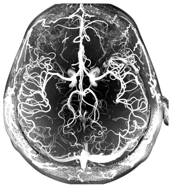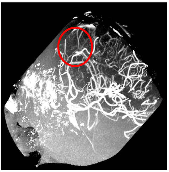 Several medical imaging methods, including X-ray [20], cone-beam computed tomography (CBCT) [21,22], and magnetic resonance imaging (MRI) [23,24], offer detailed information concerning blood flow to different regions of the brain. Cone-beam computed tomography (CBCT) imaging offers a valuable tool for assessing collateral circulation due to its high spatial resolution [21,22,25,26] and ability to capture dynamic vascular changes [12,27], as shown in Figure 2. Collateral circulation patterns in CBCT images manifest as alterations in contrast enhancement, vessel caliber, and filling patterns, reflecting the compensatory blood flow routes established in response to arterial occlusion [27,28,29]. The identification and classification of these collateral circulation patterns are essential for understanding stroke pathophysiology and guiding treatment decisions. However, manual assessment of collateral circulation from CBCT images is challenging and prone to inter-observer variability [30]. Hence, the development of automated methods utilizing deep learning techniques holds promise for providing rapid and objective evaluation of collateral circulation in ischemic stroke [31,32,33].