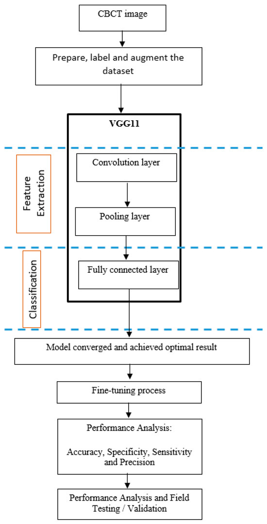 In recent years, deep learning techniques have emerged as powerful tools for medical image analysis, offering the potential to automate and improve the accuracy of diagnostic tasks [34,35,36,37]. Convolutional neural networks (CNNs), in particular, have demonstrated remarkable performance in various medical imaging applications, including lesion detection, tumor segmentation, and disease classification [38,39]. Leveraging hierarchical features learned from large datasets, CNNs can extract discriminative features from medical images, enabling automated interpretation and diagnosis. VGG11 is particularly notable for its deep architecture and was among the early models to demonstrate the effectiveness of very deep networks in image classification tasks. Table 2 provides a review of the VGG11 technique.