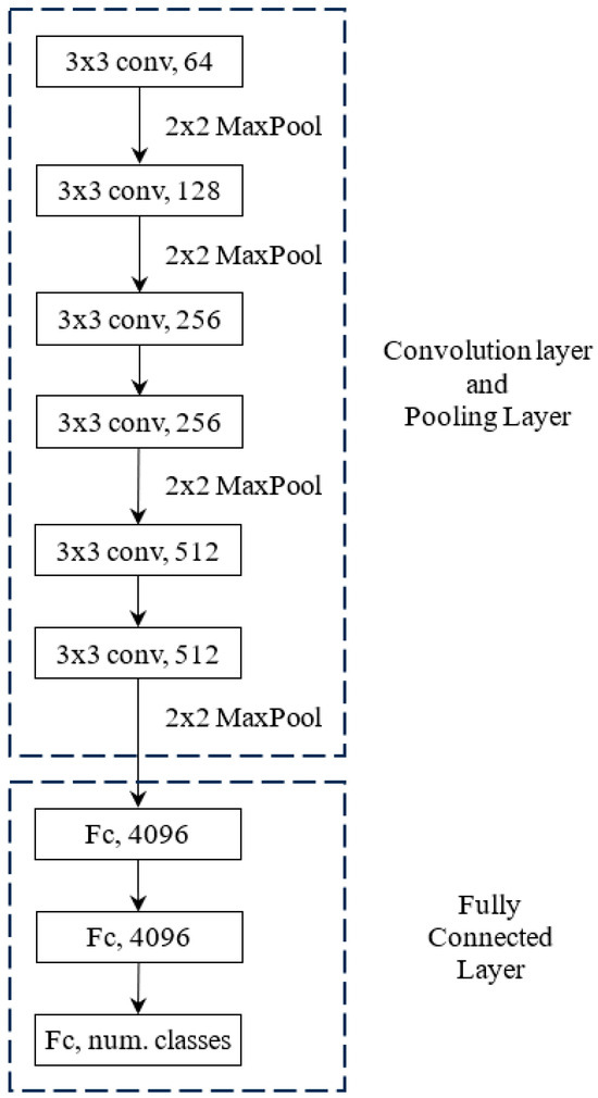 Then, the model’s architectures are selected and implemented. The architecture consists of seven convolutional layers, with each layer followed by a ReLU activation function. Furthermore, the model incorporates five 2 × 2 max pooling operations, progressively reducing the size of the feature maps by a factor of 2 at each pooling step [46]. It employs 3 × 3 kernels for all its convolutional layers, and Figure 4 provides details on the number of channels in each layer [45]. The first convolutional layer generates 64 channels, and as the network goes deeper, the number of channels doubles after each max pooling operation until it reaches 512. In the subsequent layers, the number of channels remains consistent [45].