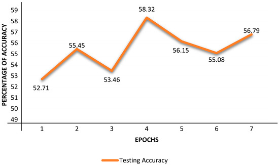 Figure 6 illustrates the testing accuracy result of the proposed model, achieving the best accuracy of 58.32%. It visually represents the model’s performance during testing, showcasing its accuracy across various evaluation metrics. The accuracy can be improved by considering a few aspects such as increasing the data size, and applying augmentation and regularization techniques. Furthermore, exploring more complex architectures or leveraging transfer learning from pre-trained models like VGG16, combined with meticulous preprocessing of input images, can further enhance accuracy by ensuring robust feature extraction and model stability.