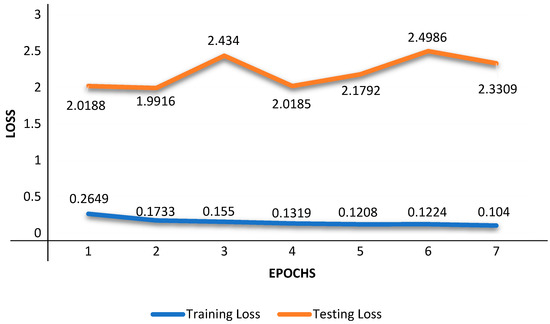 Figure 7 shows the training and testing loss results for seven epochs. It shows the comparison between training and testing loss. The graph shows that the testing loss is greater than the training loss. This could be an indication that the model is overfitting. The model performs better on the training than the testing data set.