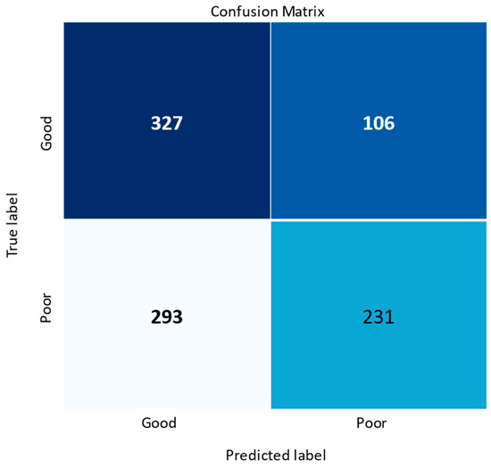 The performance of the model is evaluated through a series of experiments, yielding a comprehensive set of metric results. The effectiveness of the proposed system is meticulously assessed using a range of performance metrics discussed in detail within this section. These metrics provide valuable insights into the performance and accuracy of the models under evaluation, enabling a comprehensive analysis of their capabilities. For a comprehensive understanding of the models’ performance, metrics such as accuracy, sensitivity, specificity, precision, and F1 score are calculated and analyzed. Based on the confusion matrix in Figure 8, the best accuracy of 58.32%, a sensitivity of 75.50%, a specificity of 44.10%, a precision of 52.70%, and an F1 score of 62.10% are obtained from the calculation below.