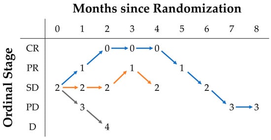 Example disease trajectories. Patients were enrolled in simulated trials with stable disease (SD) and, through probabilities modified by hazard ratios and time since randomization, either experienced partial or complete response to systemic therapy (PR and CR), disease progression (PD), and death (D). Shown are the following three sample trajectories: in blue, a patient recovers to complete response but gradually worsens to progressive disease; in orange, a patient has stable disease aside from a brief partial response; in dark grey, a patient rapidly experiences disease progression and death.