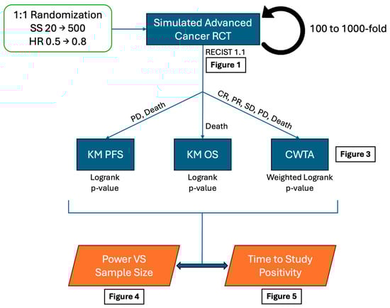 Time to first significant efficacy was determined by calculating the mean and standard deviation of 100-fold and, for higher HR runs, 1000-fold simulations programmed across increments of sample sizes from 30 to 500 and hazard ratios from 0.5 to 0.8. Each simulated trial was incremented monthly up to 60 months and analyzed using CWTA (weighted logrank) and KM PFS and KM OS (logrank) to tabulate whether, at each monthly time point, statistical significance was reached (α < 0.05). The trials that did not reach significance were omitted from the analysis. The analysis pipeline is summarized in Figure 2 (with contextual reference to Figure 1 and Figures 3–5).
