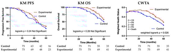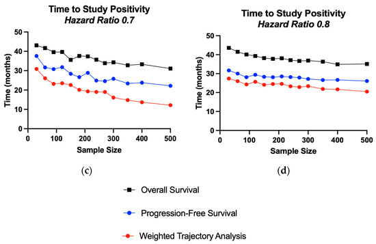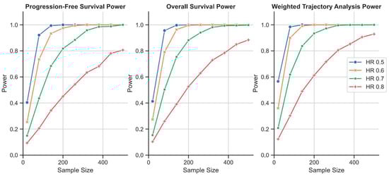 The following supporting information can be downloaded at: https://www.mdpi.com/article/10.3390/biomedinformatics4030092/s1, Figure S1: Power as a function of sample size for Kaplan–Meier estimation of progression-free survival and overall survival and Chauhan Weighted Trajectory Analysis (CWTA) using a highly active control regimen; Figure S2: Time-to-efficacy signals comparison using a highly active control regimen; Table S1: Time-to-efficacy signals comparison for (A) moderately active control regimen and (B) highly active control regimen; Table S2: 80% Power sample size interpolation for Kaplan–Meier estimation of progression-free survival and overall survival and Chauhan Weighted Trajectory Analysis (CWTA) across a range of hazard ratios using a highly active control regimen.