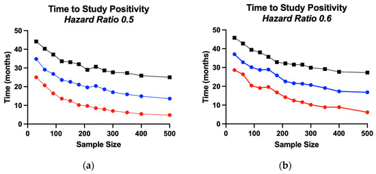 These data provide the conceptual framework for interrogating completed studies, in which datasets from advanced cancer trials could be studied to confirm the results of time to study positivity using actual trial data sequentially analyzed at similar intervals. Furthermore, in principle, the improvements in both the sample size requirements and time-to-study-efficacy signal should be evident in the setting of early-stage cancer trials; we are pursuing additional simulation work to explore this possibility.