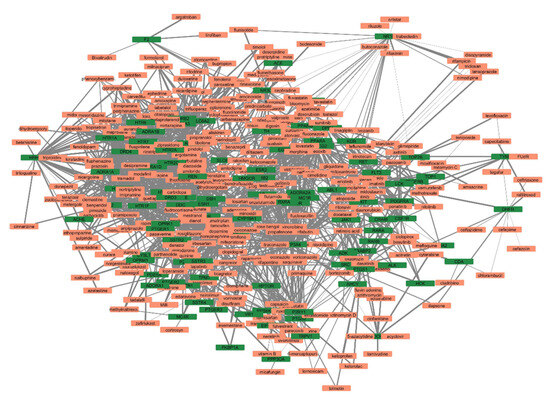 The list of unique compounds obtained by collating the compounds obtained from structural and gene expression similarity were subjected to construction of drug-target-network using STITCH database [15]. DTN resulted in 915 nodes with 7200 edges (Figure 4) (Supplementary Materials Table S5. Among 915 nodes, 504 were found to be proteins and were subjected to functional enrichment analysis using ClueGo [16] app in Cytoscape. Functional enrichment analysis revealed 2339 significant GO_biological processes, out of which 17 were found to be involved in inflammatory response and 162 in signalling pathways (Supplementary Materials Table S6, Supplementary Materials Figure S1 and Figure 5). Around, 111 terms were found to be significantly associated with cellular response (Supplementary Materials Table S7, Supplementary Materials Figure S2 and Figure 6). However, 344 and 10 terms related to Molecular function (Supplementary Materials Table S8, Supplementary Materials Figure S3 and Figure 7) and immune response (Supplementary Materials Table S9, Supplementary Materials Figure S4 and Figure 8) were found to be significantly associated with the proteins. KEGG analysis revealed around 142 significant pathways (Supplementary Materials Table S10, Supplementary Materials Figure S5 and Figure 9). Around 411 compounds were found to be significantly involved in DTN, out of which 134 compounds were found to be as anti-cancer drugs and antibiotics which were excluded from the study. The rest 266 compounds were explored for their association in ALS studies which revealed around 172 compounds (Table 3) were unexplored in ALS research, thus opening a gateway to explore these drugs for their potential in ALS treatment.