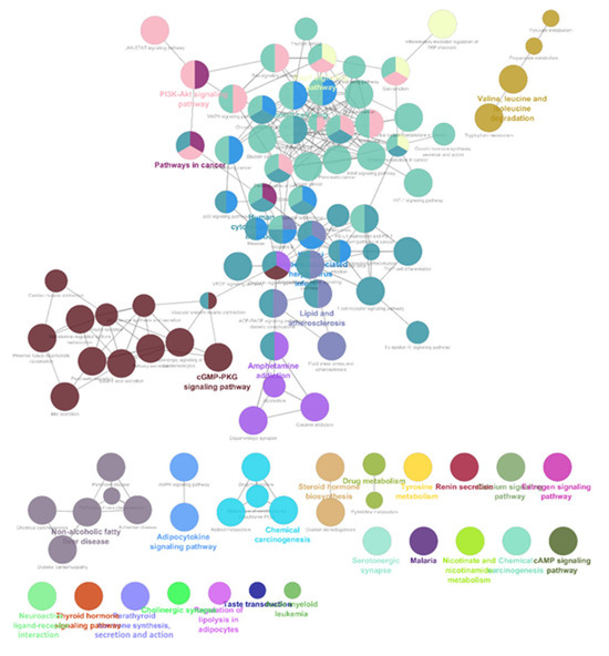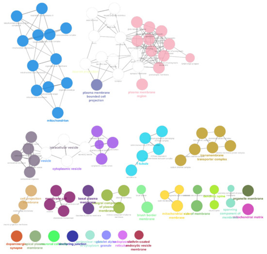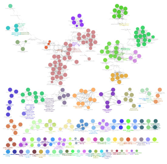 - Bindea, G.; Mlecnik, B.; Hackl, H.; Charoentong, P.; Tosolini, M.; Kirilovsky, A.; Fridman, W.H.; Pagès, F.; Trajanoski, Z.; Galon, J. ClueGO: A Cytoscape plug-in to decipher functionally grouped gene ontology and pathway annotation networks. Bioinformatics 2009, 25, 1091–1093. [Google Scholar] [CrossRef] [PubMed]
