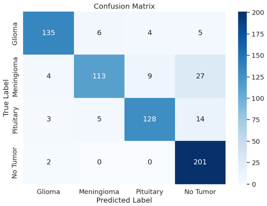 The evaluation of EfficientNetV2-S has presented the precision values from 0.94 up to 1.00 and the recall rates between 0.91 and 0.99. The F1 scores ranged from 0.94 to 1.00 in different tumor cases as a result. During training, the model achieved an accuracy of 96.69 and an F1 score of 0.9673, with a training loss as low as 3.0644. Upon testing, the test accuracy went down to 96.19% and an F1 score of 0.9629 with a test loss of 3.0673. In the validation phase, accuracy was 95.27, and the F1 score was 0.9586, with a validation loss of 3.0861. Overall, the loss was approximately the same across the training, validating, and testing phases. Overall, the model’s performance was average. Table 3 shows the model performance metrics, Table 6 shows the classification metrics, and Figure 4 shows the confusion matrix for EfficientNetV2-S.