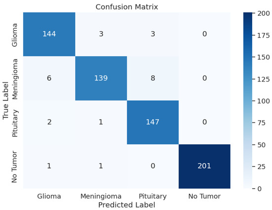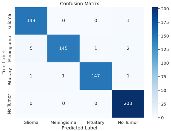 During the training phase of the model with Xception, the model achieved an excellent Training Accuracy of 99.49%, with an F1 score of 0.9949 and a training loss as low as 0.5046. Overall, the minimum F1 score found across all the classes is 0.97, and the maximum is 0.99. Additionally, Recall reached the maximum possible value of 1 for class 2, an overall average of 0.98, and an average precision of 0.98. Upon validation, the accuracy reached 99.39% and an F1 score of 0.9933 with a validation loss of 0.5079; these metrics are very close to the training metrics, which shows that the model learned exceptionally well. Upon testing, the model had a test accuracy of 98.17%, which is the highest test accuracy across the 5 pre-trained models. It also had a higher test F1 score of 0.9817, with the test loss being 0.5265. The model’s classification outcomes over different tumor types had an average of 0.98 across precision, recall, and F1-score. Table 3 shows the model performance metrics, Table 5 shows the classification metrics, and Figure 3 shows the confusion matrix for Xception.