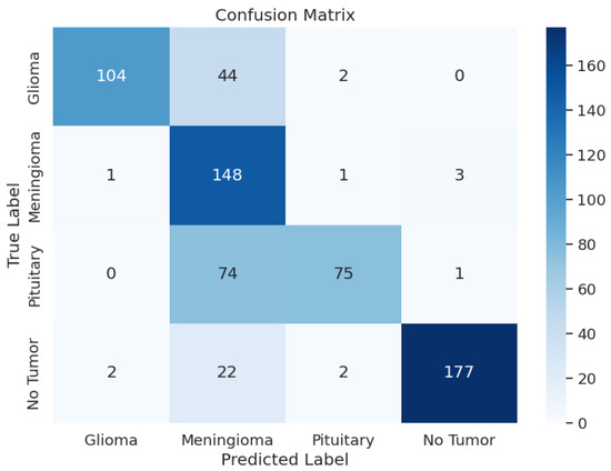 The Dense layer with 256 units is regularized using L2 regularization with a coefficient of 0.015, L1 activity regularization with a coefficient of 0.005, and L1 bias regularization with a coefficient of 0.005 [22]. The activation function used for this Dense layer is ReLU [23]. Additionally, BatchNormalization layers are applied to stabilize training by normalizing the input to each layer. The batch normalization layer is configured with a momentum of 0.99 and an epsilon value of 0.001 [24,25,26]. The final Dense layer, or output layer, consists of 4 units with a Softmax activation function for multi-class classification, providing the probability distribution of the input belonging to each of the four classes: pituitary, meningioma, glioma, and no tumor [27].
