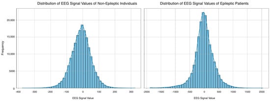 Distribution of values of EEG signals of non-epileptic individuals (left panel) and epileptic patients (right panel). A difference in value range and value distribution is observed.