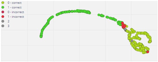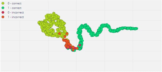 Based on the above layer combination, this architecture was able to achieve 98.3% specific accuracy in the validation set while achieving 0.05 loss and 98.18% accuracy in the test set. The following figures show two scatter plot diagrams of the validation and test set data. Figure 3 represents the performance of the model using the validation set, while Figure 4 represents the performance using the test set. Both figures include yellow-colored points representing correctly predicted data with label 0, expressing signals in non-epileptic individuals, and purple-colored points representing incorrectly predicted data with label 0. The green points represent correctly predicted data with label 1, expressing signals in epileptic patients, while the orange-colored points indicate incorrectly predicted data with label 1. It is important to mention that in the scatter plot of the test set, a small number of points (two points) were classified as unknown and are colored grey.